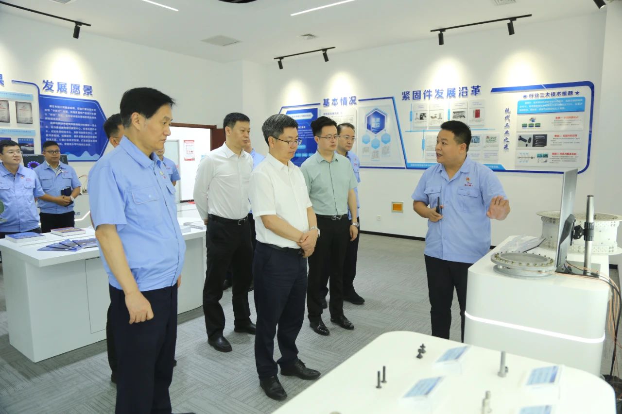 27日上午,陳錫明一行來(lái)到航天精工,深入航天精工研究院、機(jī)加鐓制車(chē)間、高端抽芯鉚釘自動(dòng)化生產(chǎn)線(xiàn)等科研生產(chǎn)一線(xiàn)開(kāi)展實(shí)地調(diào)研。陳錫明詳細(xì)了解了航天精工技術(shù)研發(fā)和產(chǎn)品配套等方面情況,聽(tīng)取了航天精工關(guān)于生產(chǎn)經(jīng)營(yíng)、發(fā)展規(guī)劃、黨的建設(shè)和巡視整改等方面的情況匯報(bào)。
