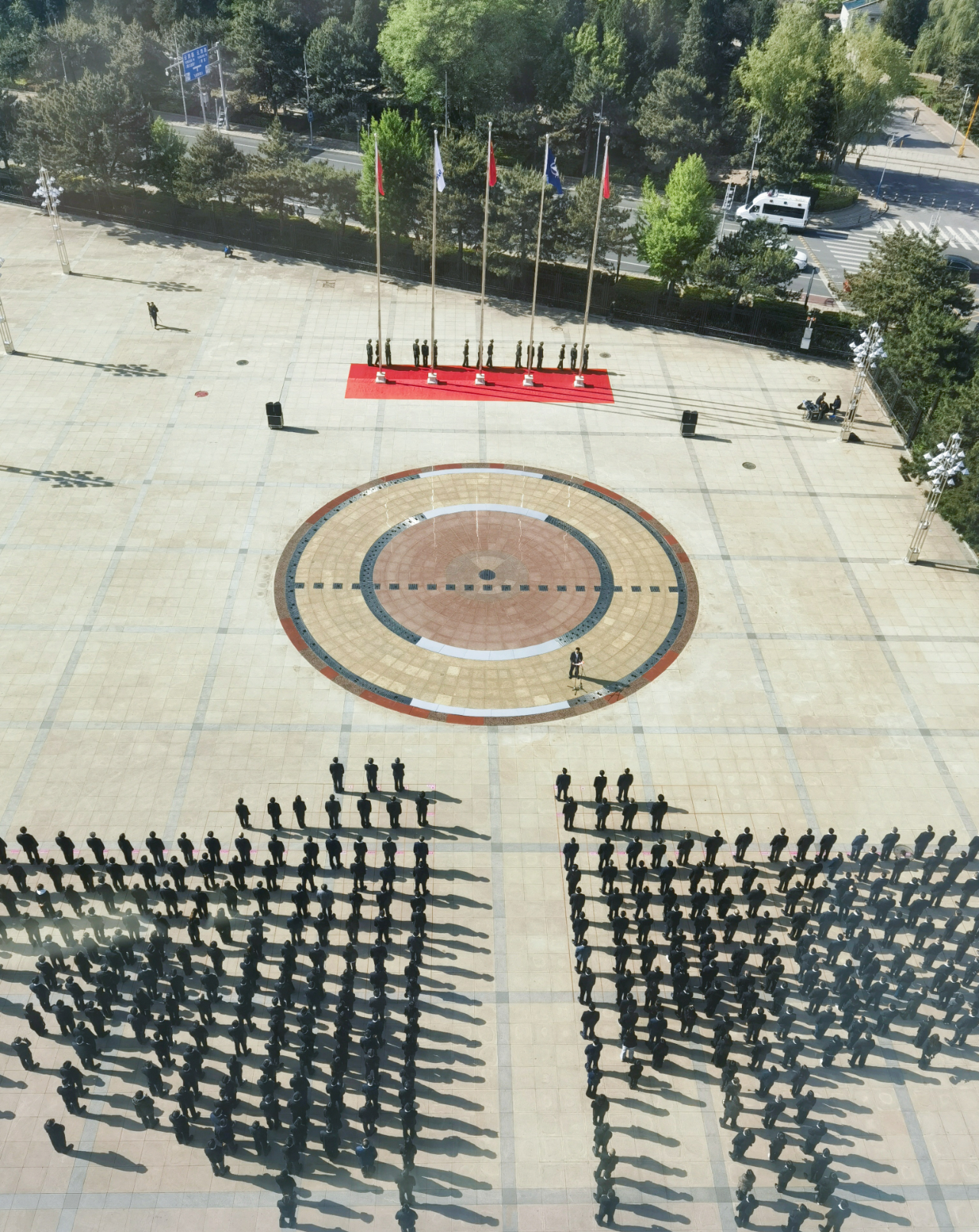 國旗護衛隊英姿颯爽、步伐鏗鏘,昂首闊步走向升旗臺。伴隨著雄壯的國歌和航天科工之歌,五星紅旗、集團公司司旗和三院院旗冉冉升起,在場的干部職工肅立行注目禮。