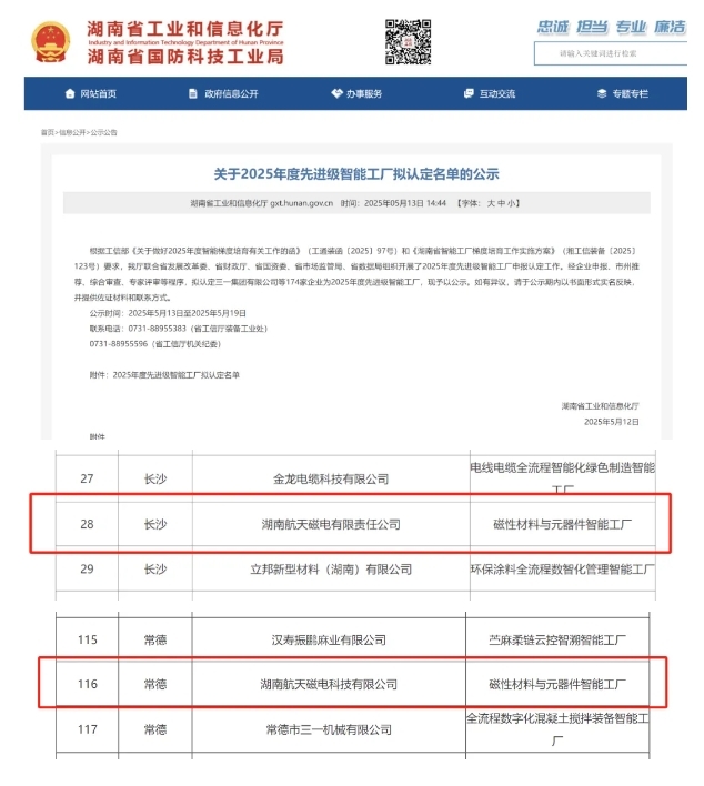 近日,湖南省工業和信息化廳公布了2025年度先進級智能工廠擬認定名單,湖南航天所屬湖南磁電及其子公司磁電科技雙雙成功入選,成為磁性材料與元器件智能化升級的典型范例。