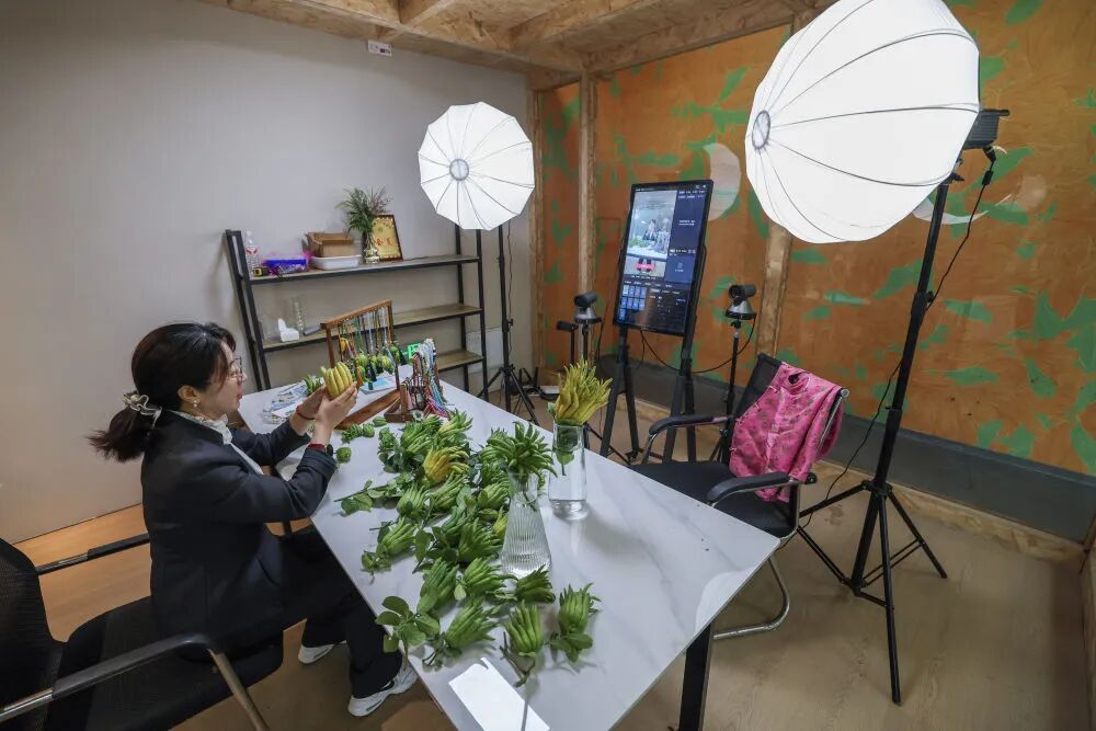 在浙江金華市金東區赤松鎮北山口村的金華佛手農林服務中心內的直播間,工作人員進行佛手鮮果及衍生產品的直播銷售(2025年10月22日攝)。新華社記者 徐昱 攝