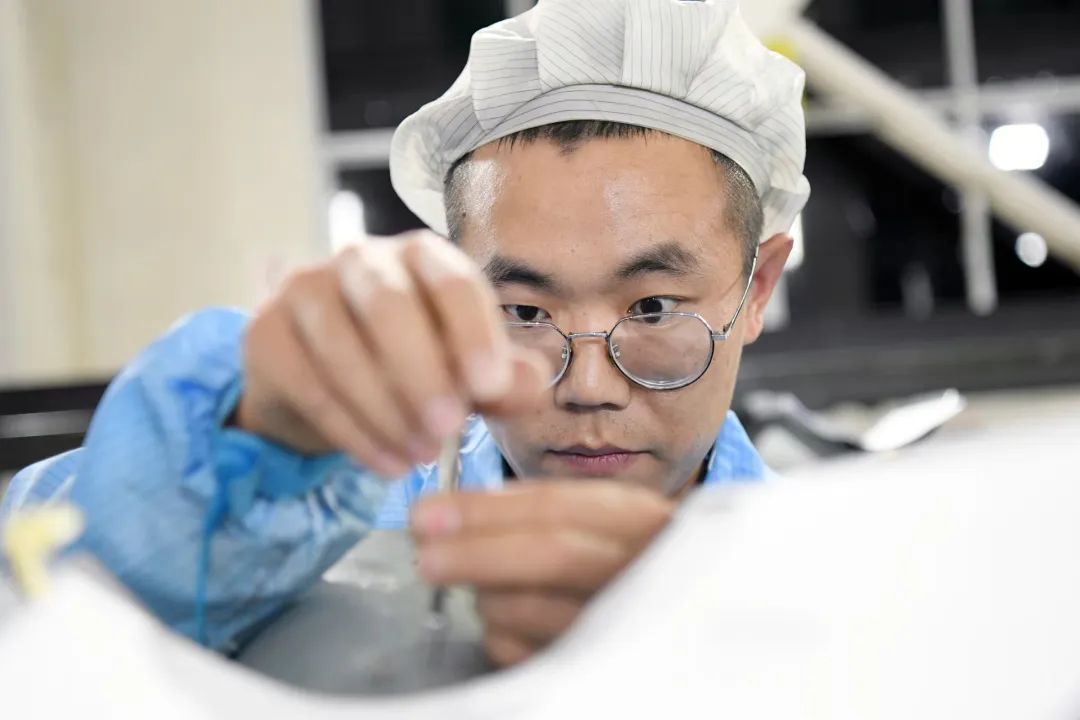 “我們兩個(gè)繼續(xù)組裝,你對(duì)裝好的再檢測一遍后提交檢驗(yàn)。”“晚走一點(diǎn),把材料烘好,明天白班直接上手干。”他們邊吃邊討論著工作安排。“干!”其中一名生產(chǎn)人員喊了一聲,休息加上用餐時(shí)間不到15分鐘的他們,一起起身朝工位走去。